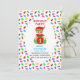 Cute elf holding a gift box and multicolored bear sweets first baby birthday Invitation. Texts and numbers ready to be personalised for all kid ages!