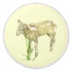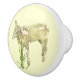This ceramic door know features a sweet little lamb just three weeks old. He is munching on grass against a yellow background.