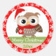 The baby owl in shades of light and dark brown with shades of pink patterns on the white background and the text areas are in moss green and maroon. Snow flakes in white on the red background. This is a digital illustration and customisable.