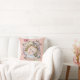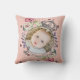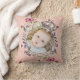 Cute Baby Photo Keepsake Name Birth Date Custom Throw Pillow. This adorable design features a crown and flowers and a vintage style scroll that you can customise. It has a pink patterned background that is fashioned like vintage paper. Great to feature cute and loving photos of loved ones!