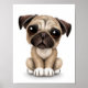 This cute design features a small pug puppy dog with large black eyes. The dog is sitting down with its paws beside each other and is looking forward with its head slightly tilted to one side. The over sized head and small body along with the details in the fur create a beautiful combination of a cartoon and realistic look. This unique and adorable design is perfect for all dog and pet lovers.