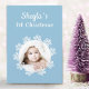 Cute Baby˙s 1st Christmas Snowflake Photo Holiday Card. Cute design with the baby`s photo sorrounded by beautiful white snowflakes - also on the backside. The background is blue. Add your photo and your name on the card.