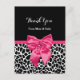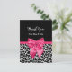 A cute pink and black baby shower gift thank you postcard with a girly black and white giraffe print and a bright hot pink ribbon tied into a pretty bow. Personalise this stylish animal print baby gift thank you by adding adding a special message of thanks from mummy and baby. Flat printed image, not actual ribbon.