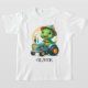 This personalised adorable and whimsical t-shirt features a charming little dinosaur joyfully driving a miniature blue tractor.
