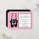 A birthday invitation with a black illustration of a ballet dancers slippers and her lower legs which are transparent allowing the colour of the background / item to show through. Ballerina is standing on her toes, en pointe. Background is a pattern made of white polka dots on pink. Would also be perfect for a ballet recital invitation.