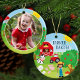 Give your little farmer her own special custom barnyard Christmas ornament! Holiday ornament has a cow, pig, sheep, cat, chicken, horse, and duck. Smiling in the corner is a bright yellow sun and in the foreground is an apple tree and young farmer kid. The pig has baby piglets and the sheep has a little lamb. Personalise the ornament with your young girl's first name on the front and the year and a photo on the back.