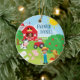 Give your little farmer his own special custom barnyard Christmas ornament! Holiday ornament has a cow, pig, sheep, cat, chicken, horse, and duck. Smiling in the corner is a bright yellow sun and in the foreground is an apple tree and young farmer kid. The pig has baby piglets and the sheep has a little lamb. Personalise the ornament with your young boy's first name on the front and the year and a photo on the back.