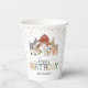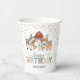 Cute barnyard birthday party paper cups featuring a simple white background, adorable farm animals including a cow, goat, pig, sheep, donkey, horse, rabbit, duck & a rooster, the saying "happy birthday", and the childs name.