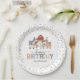 Cute barnyard birthday party paper plates featuring a simple white background, adorable farm animals including a cow, goat, pig, sheep, donkey, horse, rabbit, duck & a rooster, the saying "happy birthday", and the childs name.