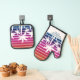Cute custom beach oven mitt and pot holder set for a destination wedding gift or family island home near the ocean. Cool personalised present featuring tropical palm trees and pretty pink and blue and your name underneath the coastal horizon.