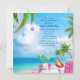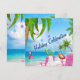 This topical Christmas holiday celebration invitation features two colourful winter birds and a pink flamingo, with a Santa hat, enjoying the beautiful beach under a palm tree decorated with lights and ornaments.