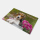 A young puppy-eyed tricolor Beagle puppy is sitting in a milk churn admist pink flowers The Beagle is a scenthound dog breed with a gentle temperament. A cute doggy photo taken by Katho Menden. This photo printing door mat is a gift idea for dog lovers. http://www.zazzle.com/kathom_photo