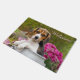 A young puppy-eyed tricolor Beagle puppy is sitting in a milk churn admist pink flowers The Beagle is a scenthound dog breed with a gentle temperament. A cute doggy photo taken by Katho Menden. This doormat is a gift idea for dog lovers.