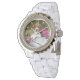 A young puppy-eyed tricolor Beagle puppy is sitting in a milk churn admist pink flowers The Beagle is a scenthound dog breed with a gentle temperament. A cute doggy photo taken by Katho Menden. This rhinestone watch with dial-plate for women is a gift idea for dog lovers. http://www.zazzle.com/kathom_photo