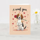 This pun greeting card shows a sweet beagle standing up on its back legs, facing you like it’s ready to give a gift. The dog has a tri-color coat with warm brown, white, and black patches, and it holds a single red rose with a green stem gently in its mouth. Its big blue eyes look kind and sincere, and a little pink tongue peeks out, adding to the friendly expression. Above the dog, the text says “i woof you” in black script lettering, placed near the top of the card. The background is a soft peach color with small red hearts scattered around, setting a romantic tone. A faint shadow under the beagle helps it feel grounded on the page, while the rest of the design stays simple and clear. It’s a cute way to say you care, whether it’s for a partner, friend, or someone who loves dogs ❤️