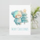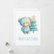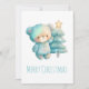 A flat Christmas card with an adorable illustration. A cosy bear with stars and sparkles in its fur. Standing beside a Christmas tree. Pastel blue-green colour. Whimsical and cute.