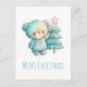 Christmas postcard with an adorable illustration. A cosy bear with stars and sparkles in its fur. Standing beside a Christmas tree. Pastel blue-green colour. Whimsical and cute.