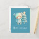 Christmas postcard with an adorable illustration. A cosy bear with stars and sparkles in its fur. Standing beside a Christmas tree. Pastel blue-green colour. Whimsical and cute.