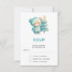 RSVP card with an adorable illustration. A cosy bear with stars and sparkles in its fur. Standing beside a Christmas tree. Pastel blue-green colour. Whimsical and cute.