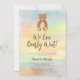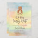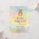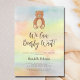 This baby shower invitation is decorated with a cute hand-painted teddy bear and a watercolor rainbow background.