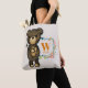 A personalised tote bag with your monogram initial and name. Designed with a cute illustration of a cartoon brown bear holding a yellow daisy. Surrounded by a decorative floral wreath with flowers, leaves, sprigs and hearts. Autumn colour scheme.