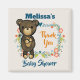 A baby shower thank you magnet designed with a cute illustration of a cartoon brown bear holding a yellow daisy. Surrounded by a decorative floral wreath with flowers, leaves, sprigs and hearts. Autumn color scheme.