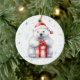 Any little girl would love to have this cute Holiday ornament from her grandparents! The front features an adorable white polar bear wearing a red and white Santa Claus hat, and holding a brightly wrapped Christmas gift. A retro style border of pastel stars surrounds the image. The back of the ornament has the same border with text fields for you to customise. This can easily be changed for a daughter or son from parents, too. Make it say whatever you'd like!