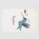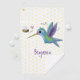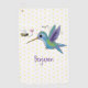 This cute design features a green and purple happy hummingbird with a bee friend on a yellow polka dot background . All done in happy cartoon illustration style!