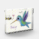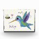 This cute design features a green and purple happy hummingbird with a bee friend. All done in happy cartoon illustration style!