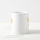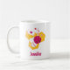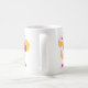 A mug with a sweet image of a pink and white striped bumble bee. A piece of yellow honeycomb behind. A letter sealed with a heart and a group of floating hearts are also part of the design.