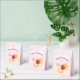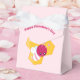 Happy Valentine's Day favour boxes with an image of a pink and white striped bumble bee. A piece of yellow honeycomb behind. A letter sealed with a heart and a group of floating hearts are also part of the design.