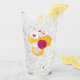 A pint glass with an image of a pink and white striped bumble bee. A piece of yellow honeycomb behind. A letter sealed with a heart and a group of floating hearts are also part of the design.