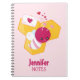 Spiral notebook with a sweet image of a pink and white striped bumble bee. A piece of yellow honeycomb behind. A letter sealed with a heart and a group of floating hearts are also part of the design. Personalise with a name and title.