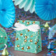 A box of souvenirs with a blue illustration of cute bees with flowers.