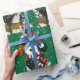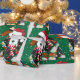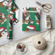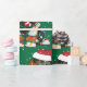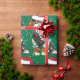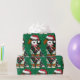 Festive Personalised Black/Tan/White Cartoon Bernedoodle Puppy wearing "Tis The Season" Santa hat, red and white striped scarf, wrapped in christmas lights. Snowy background. Cute green christmas wrapping paper for bernedoodle lovers!