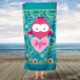 Cute personalised bath towel for kids featuring a pink bird and a circulars swirls background.
