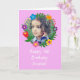 Personalise this cute Happy Birthday card with a girl's photo, name, age, and then inside with your birthday wishes (if you wish to change them) and your own name. Pink lilac background and writing more suited for girls. On the front the card has a round space framed by a floral wreath for the kid's photo, and the customisable text "Happy 4th Birthday Amelia!" in a playful font. The inside has the same font in a shade of pink, and the personalizable text reads,