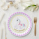 Paper plate framed with cute violet hearts and a cute birthday unicorn at the centre. "Happy Birthday" text can be personalised,
