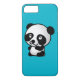 A cute and adorable illustration of a black and white panda bear sitting around looking happy, friendly and loveable. Turquoise blue background.