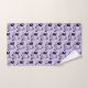A patterned towel set designed with an illustration of a smiling and waving kitty cat with a black spot around his ear. Purple background. Simple cute and adorable.