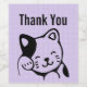 A bottle label with Thank You text (can be edited to say what you like) designed with an illustration of a smiling and waving kitty cat with a black spot around his ear. Purple polka dot background. Simple cute and adorable.