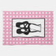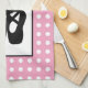 Kitchen towel with a black illustration of a ballet dancers slippers and her lower legs which are transparent allowing the colour of the background to show through. Ballerina is standing on her toes, en pointe. Background is a pattern made of white polka dots on pink.