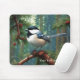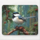 A cute black-capped chickadee (Poecile atricapillus) sits on a conifer branch in a slightly misty forest. Customise by adding your own text.