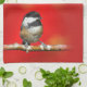 Cute Black-Capped Chickadee with Red Autumn Leaves Tea Towel