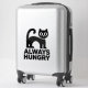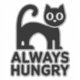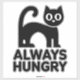 Stylised black cat with large eyes and a playful expression. The cat’s body is designed in a simple, modern shape, emphasizing its curvy tail and round form. Below the cat, the phrase “ALWAYS HUNGRY” is displayed in bold letters, also in black. The overall design is minimalist, using a monochrome colour scheme that adds to its eye-catching appeal. The combination of the cat and the text creates a humourous and charming theme, likely appealing to cat lovers.
