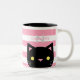 Super cute mug with pink and white stripes, and an adorable black cat with yellow eyes.