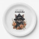 Paper plates with a cute illustration. A black long-haired cat wearing a black witch's hat. It's ears poking out. Surrounded by orange and brown autumn flowers. Awesome design for witch themed items and Halloween.