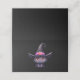 A place card with a fun Halloween themed illustration for cat lovers. A big-eyed black cat wearing a large black witch's hat with a purplish pink belt around the brim.