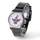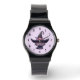 A watch with a fun Halloween themed illustration for cat lovers. A big-eyed black cat wearing a large black witch's hat with a purplish pink belt around the brim.