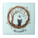 A cute black kitten sitting in a woven branch wreath watches a silver star that is hanging from a tree branch.